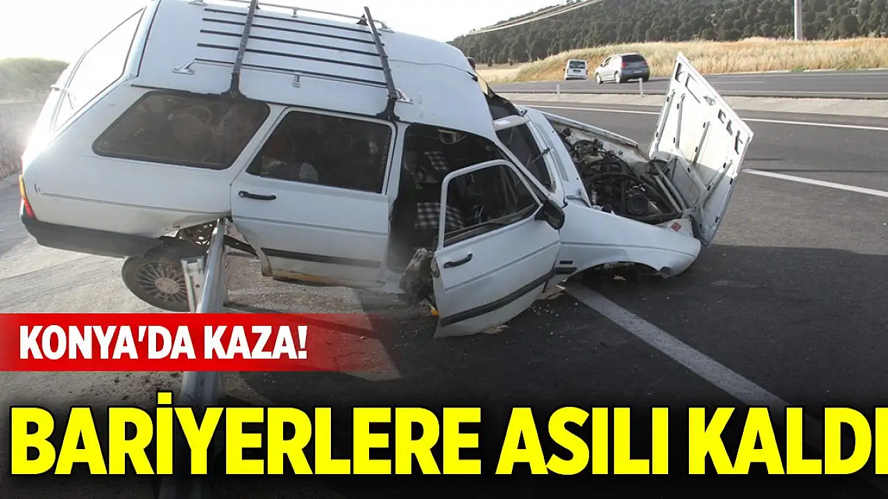 Konya'da meydana gelen kazada çarptığı bariyerlere asılı kalan otomobilin içindeki 3 kişi yaralandı.