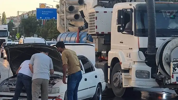 Konya'nın Kulu ilçesinde kırmızı ışıkta bekleyen otomobilin motor kısmında çıkan yangın, çevredeki vatandaşlar ve ışıklarda bekleyen KOSKİ'ye ait arasözdeki çalışanların müdahalesiyle söndürüldü.