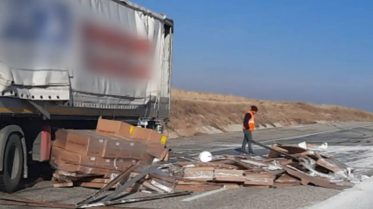 Bu sırada tırın direksiyon hakimiyetini kaybeden sürücü ani fren yaparak aracı durdurunca dorsedeki mobilya parçaları ve boya paketleri yola düştü. Bazı boya kutuların patlaması sonucu yola boyalar saçıldı. Olayı gören diğer sürücülerin 112 Acil Çağrı Merkezine ihbarda bulunması üzerine olay yerine jandarma ekipleri sevk edildi.