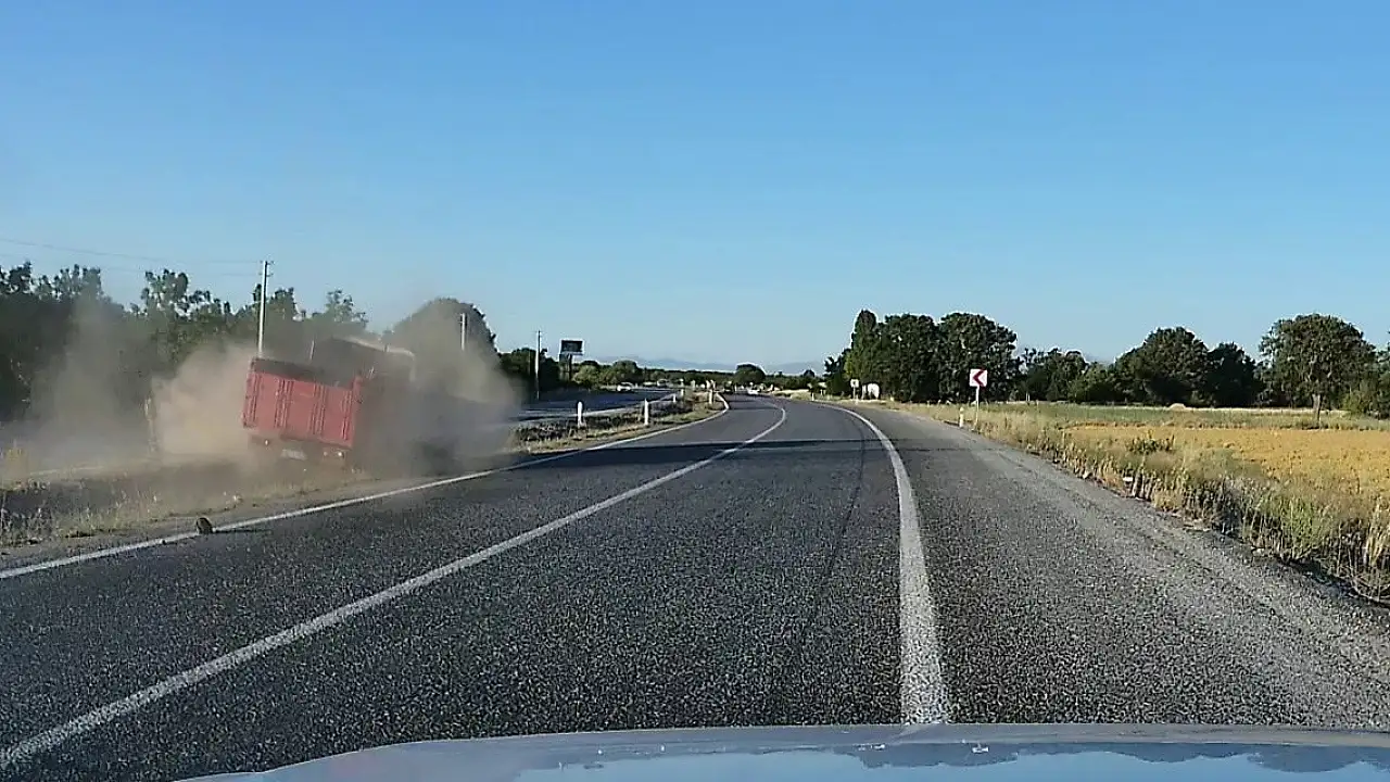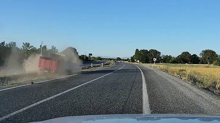 Konya'nın Beyşehir ilçesinde seyir halindeyken lastiğinin patlaması sonucu kontrolden çıkan kamyon refüje inerken, sürücü ustalıkla kamyonu devrilmeden ve karşı şeride geçip muhtemel başka bir kazaya sebep olmadan durdurmayı başardı. Yaşanan korku dolu anlar arkada seyir halinde olan bir otomobilin araç kamerasına yansıdı.