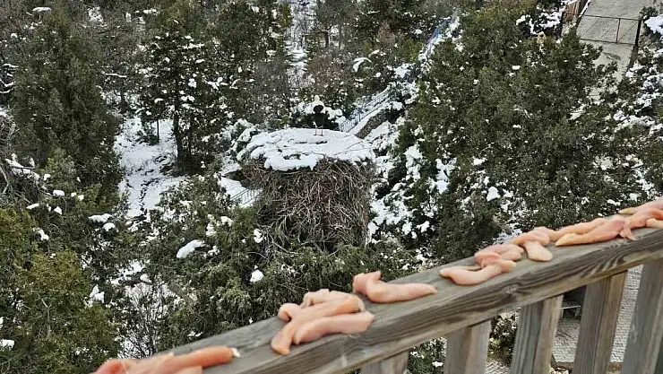 Konya'nın Beyşehir ilçesinde kar yağışı ve ardından etkili olmaya başlayan soğuk hava sürprizi ile karşılaşan leyleklerin yaşam alanı olan yuvalarına besin takviyesi yapıldı.