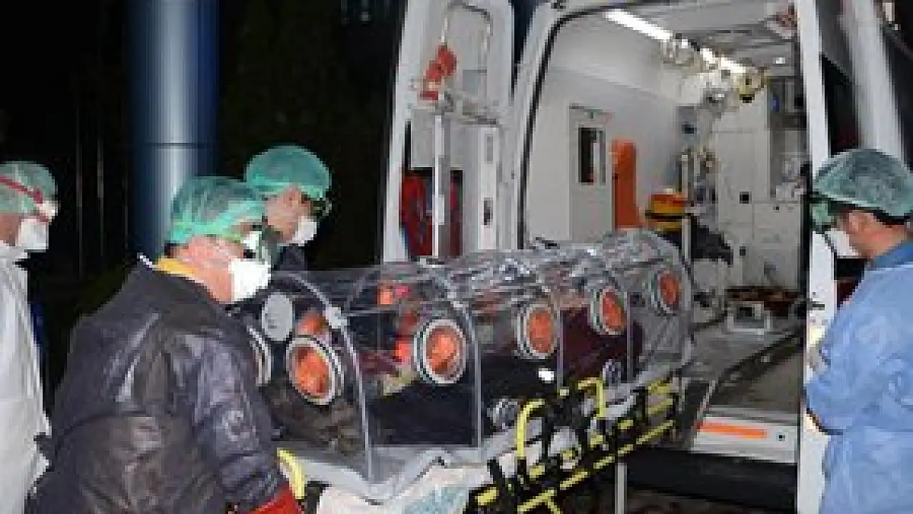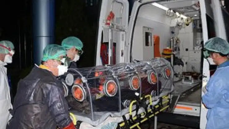 Konya'dan gönderilen özel donanımlı ambulansa alınan A.G, izole edilmiş sedye içinde hastaneye getirildi.