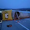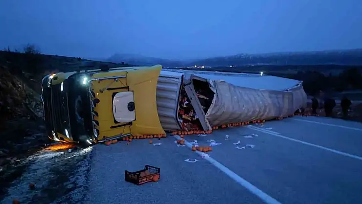 Konya'nın Beyşehir ilçesinde meyve yüklü tırın devrilmesi sonucu yol ulaşıma kapanırken yaralı sürücü hastaneye kaldırıldı.
