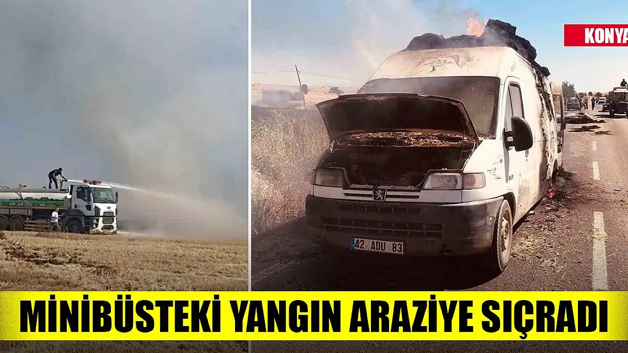 Konya'da saman balyası yüklü minibüste çıkan yangında alevlerin araziye sıçraması sonucu 20 dönümlük alanda bulunan saman balyaları da yandı.