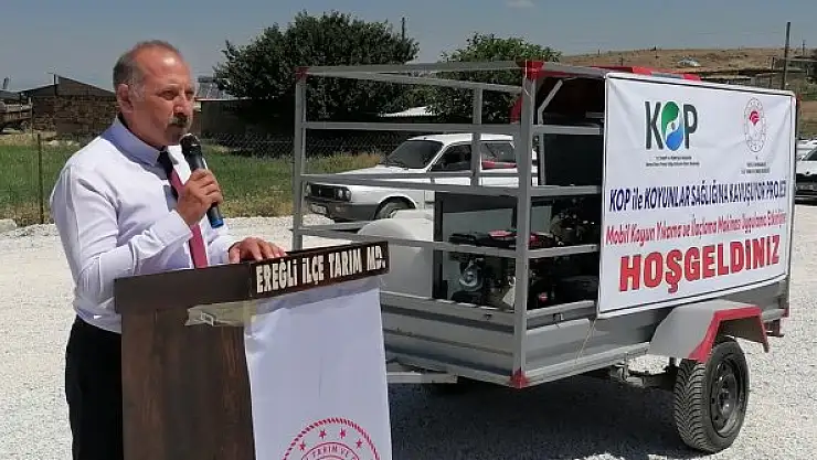 Konya'nın Ereğli ilçesinde KOP İdaresi tarafından desteklenen ve Ereğli İlçe Tarım ve Orman Müdürlüğü tarafından uygulanan "KOP ile koyunlar sağlığına kavuşuyor" projesi kapsamında mobil koyun yıkama ve ilaçlama makineleri Yellice Mahallesinde hizmete sunuldu.