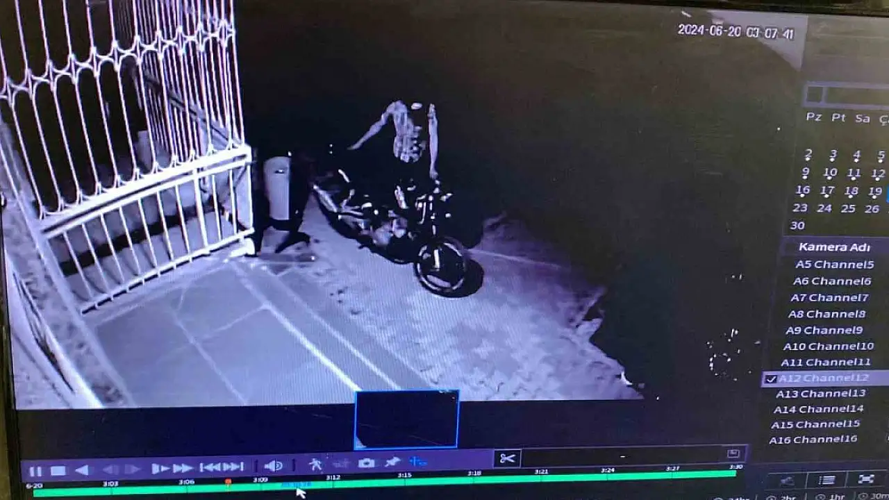 Motosiklet hırsızlığı ise saniye saniye güvenlik kamerasına yansıdı. Görüntülerde şüphelinin 5 dakikada motosikletin kilitlerini kırdıktan sonra itekleyerek bahçeden çıkarması, motosikleti çalıştırmak için uğraşması ve motosikleti çalıştırdıktan sonra gidişi yer alıyor.