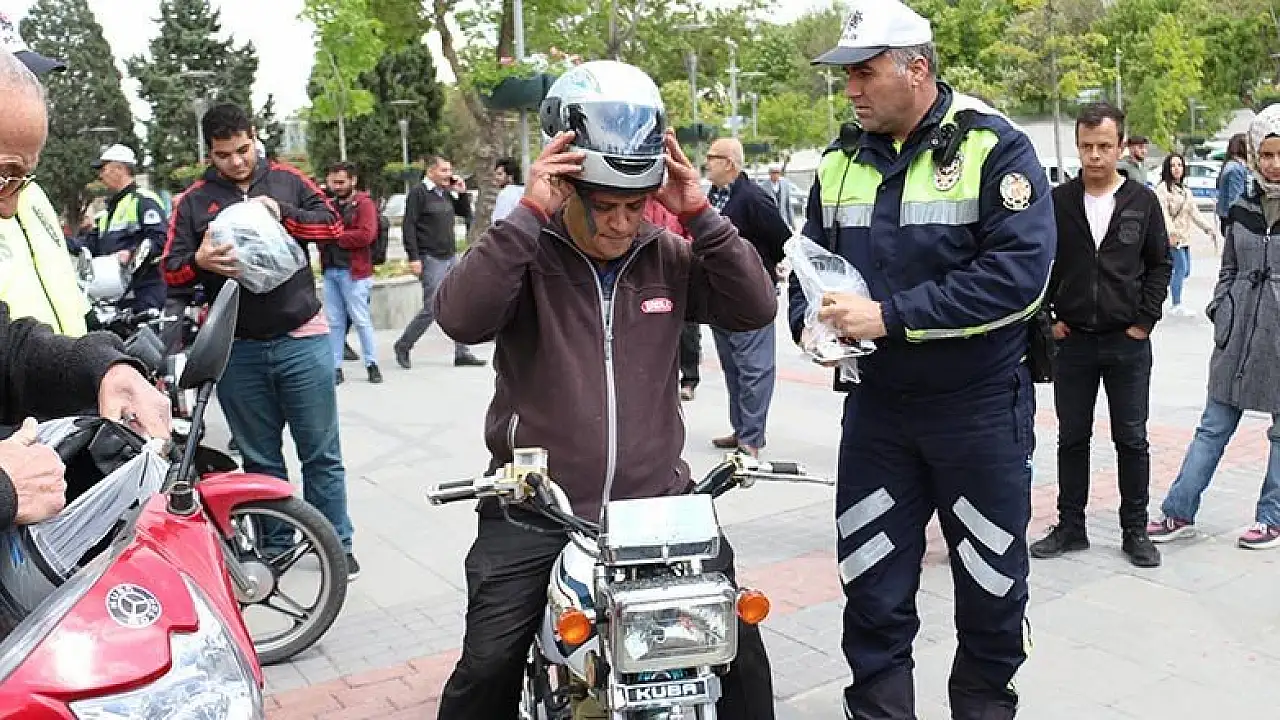 Konya'da, Karayolu Trafik Haftası dolayısıyla İl Emniyet Müdürlüğünce motosiklet sürücülerine kask dağıtıldı.