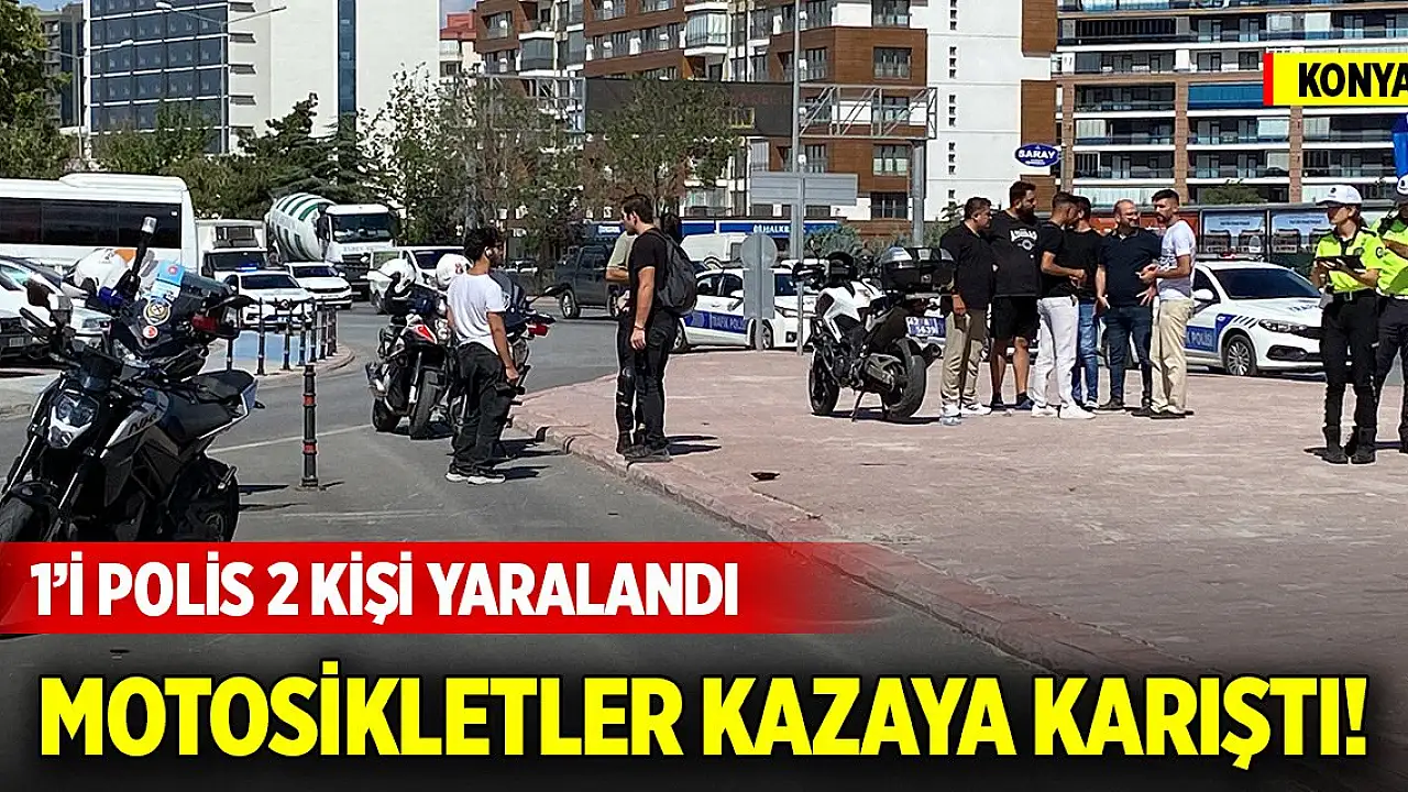 Konya'da motosikletli polis ekibi ile aynı yönde seyir halinde olan motosikletin karıştığı kazada 1'i polis 2 kişi yaralandı.