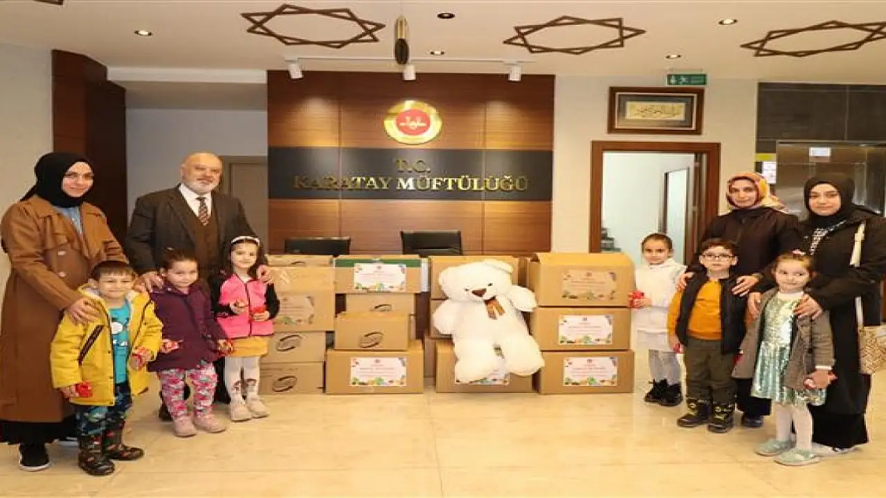 Kur’an Kursu Yöneticisi Rabia Kılıç, öğreticiler ve 4-6 yaş öğrencilerden oluşan bir heyet Karatay İlçe Müftüsü Musa İmamoğlu nezaretinde temin edilen oyuncaklar ile paraları depremzede kardeşlerine ulaştırmak üzere Türkiye Diyanet Vakfı Karatay Şubesine teslim ettiler.