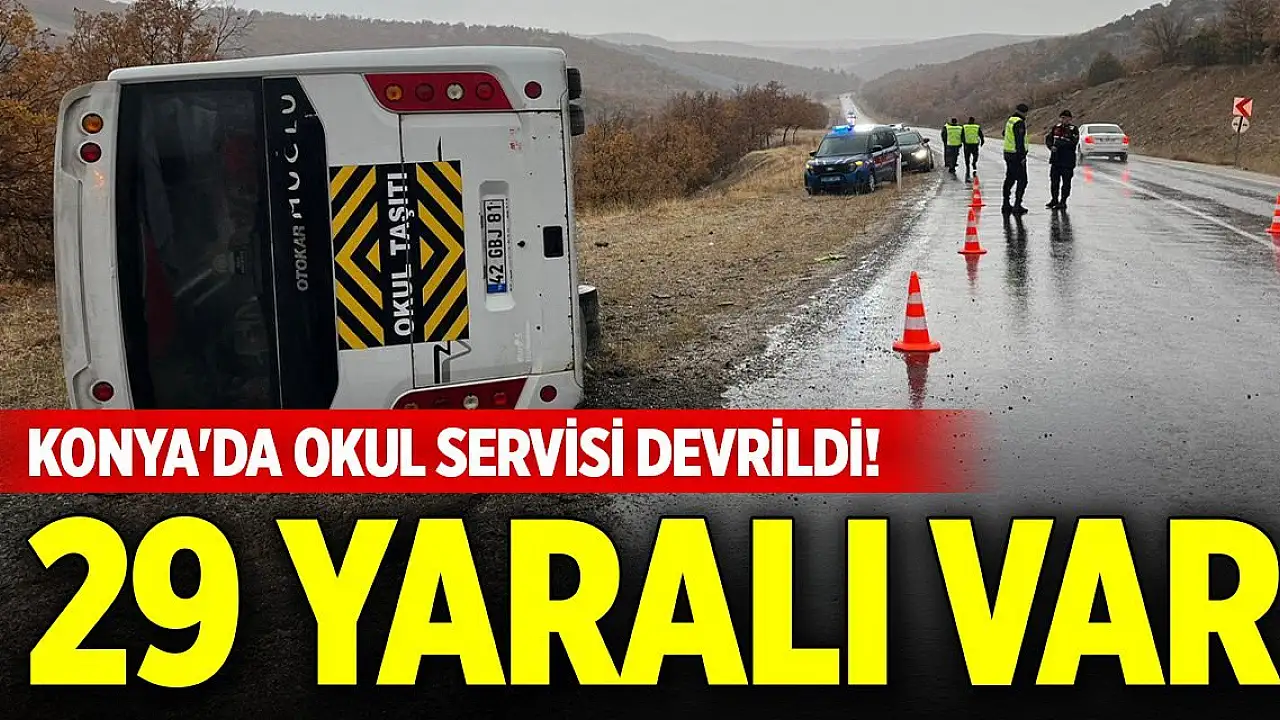 Konya'da okul servisinin kayganlaşan yoldan çıkıp, devrildiği kazada 28'i öğrenci 29 kişi yaralandı.