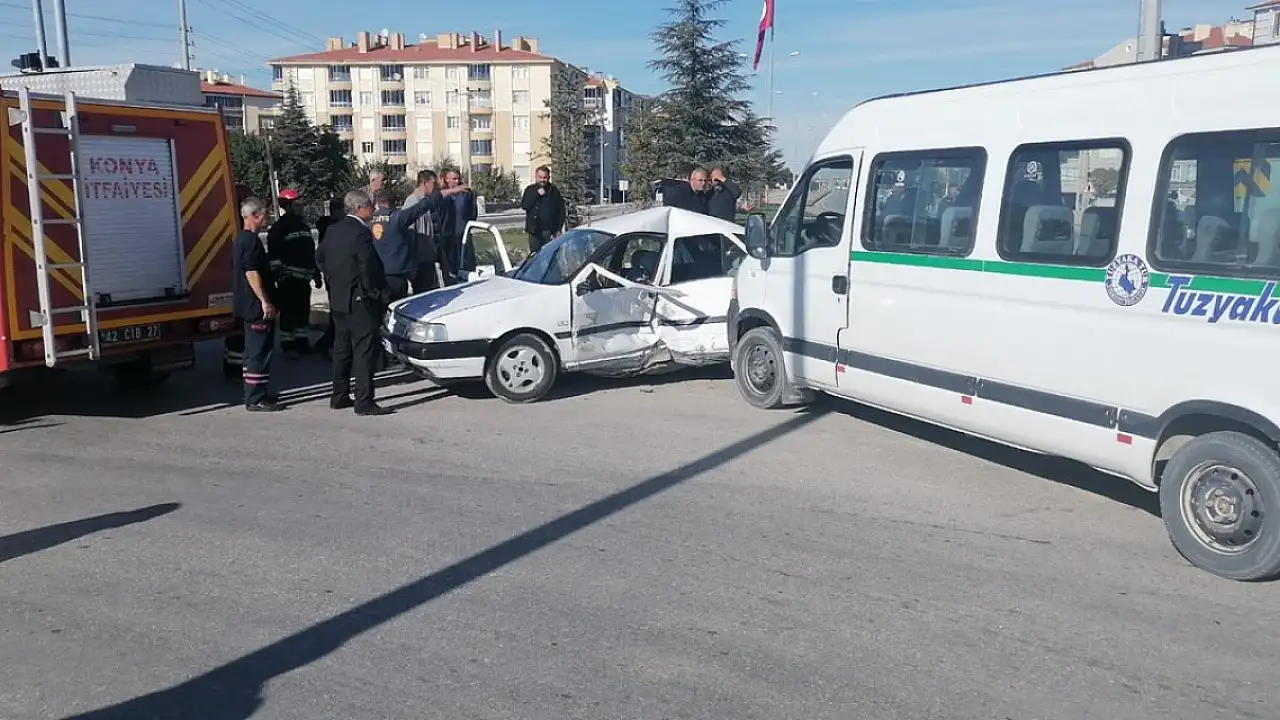 Konya'da meydana gelen trafik kazasında okul servisi ile otomobilin çarpışması sonucu sürücü ve oğlu yaralandı.
