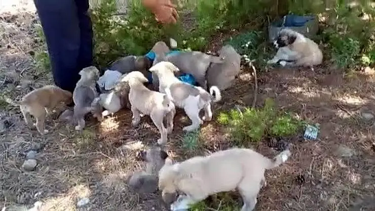 Konya'nın Beyşehir ilçesinde ormanlık alana bırakılan çok sayıda köpek yavrusu görenlerin tepkisini çekti.