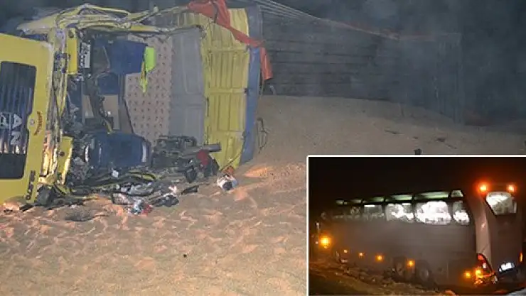 Konya'nın Ereğli ilçesinde devrilen kamyona çarpan otobüsteki 5 kişi yaralandı.