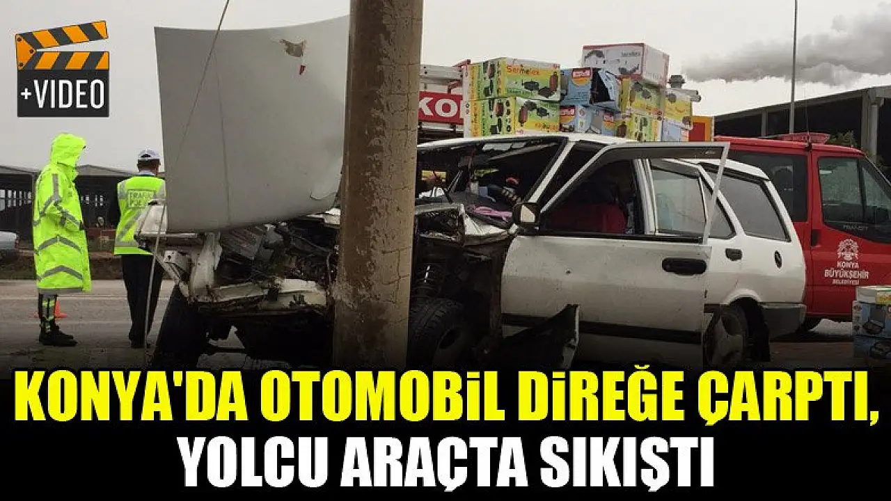 Konya'da otomobil direğe çarptı, yolcu araçta sıkıştı!