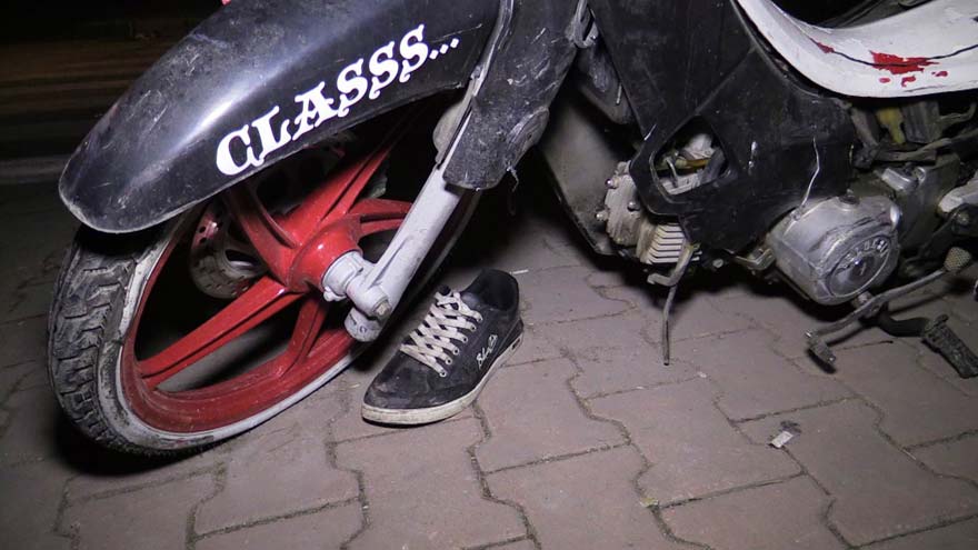 Kaza sonrası motosikletin parçaları çevreye saçılırken, sürücünün ayakkabısı da olay yerinde kaldı.