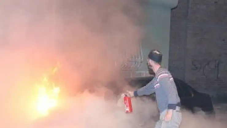 Konya'da park halindeki bir otomobilde çıkan yangına ilk müdahaleyi, kovalara doldurdukları su ve yangın söndürme tüpleriyle mahalle sakinleri yaptı.
