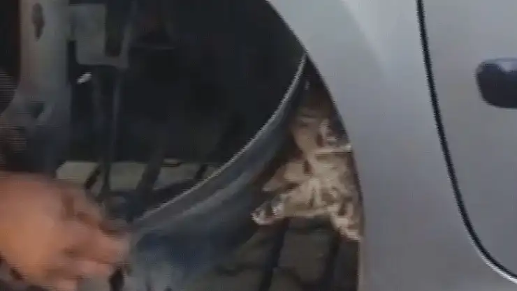 Konya'da otomobilin çamurluğunun arka kısmına sıkışan kediyi oto tamircisi kurtardı. O anlarda cep telefonu kamerasıyla kaydedildi.