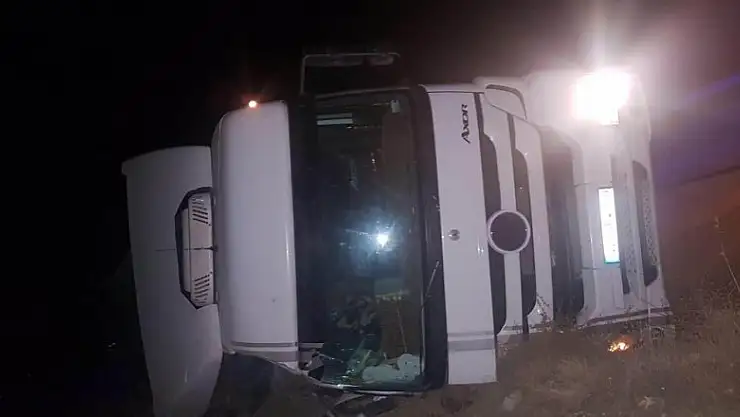 Kaza, dün saat 23.30 sıralarında Kulu Konya karayolunun Günahkar yaylası yakınlarında meydana geldi. Edinilen bilgiye göre, İ.D. idaresindeki 42 GR 379 plakalı pancar yüklü tır, sürücünün viraja girdiği sırada direksiyon hakimiyetini kaybetmesi sonucu kontrolden çıkarak şarampole devrildi. Yan yatan tırdan yaralı halde kendi çabasıyla çıkan sürücü İ.D., polise ve sağlık ekiplerine haber verdi. Yaralanan sürücü olay yerine sevk edilen ambulansla Kulu Devlet Hastanesine kaldırılarak tedavi altına alındı.