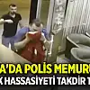 Daha sonra polis memuru bayrağın düştüğünü fark ederek giriş kapısına yöneliyor ve bayrağı yerden alıp 3 defa öptükten sonra görevliye vererek tekrar yerine asılmasını sağlıyor.