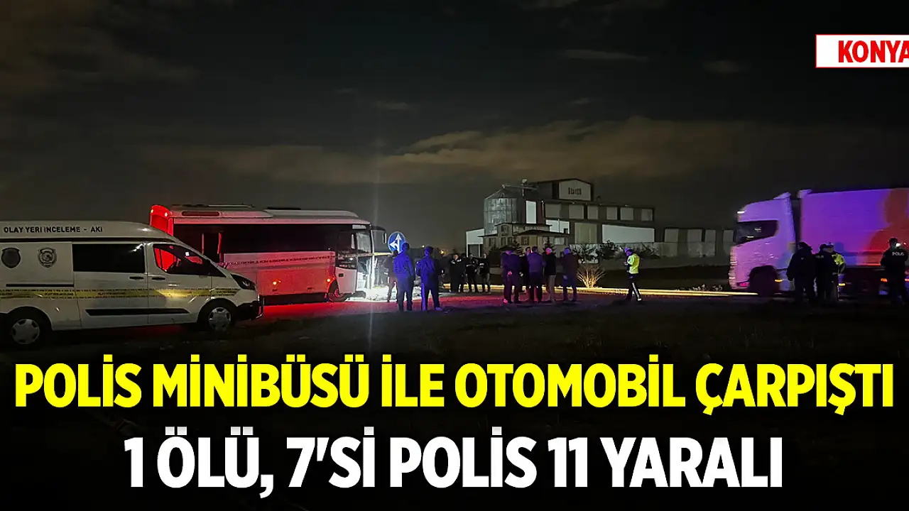 Konya'da polis minibüsü ile otomobilin çarpışması sonucu meydana gelen trafik kazasında 1 kişi hayatını kaybette, 7'si polis 11 kişi yaralandı.