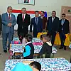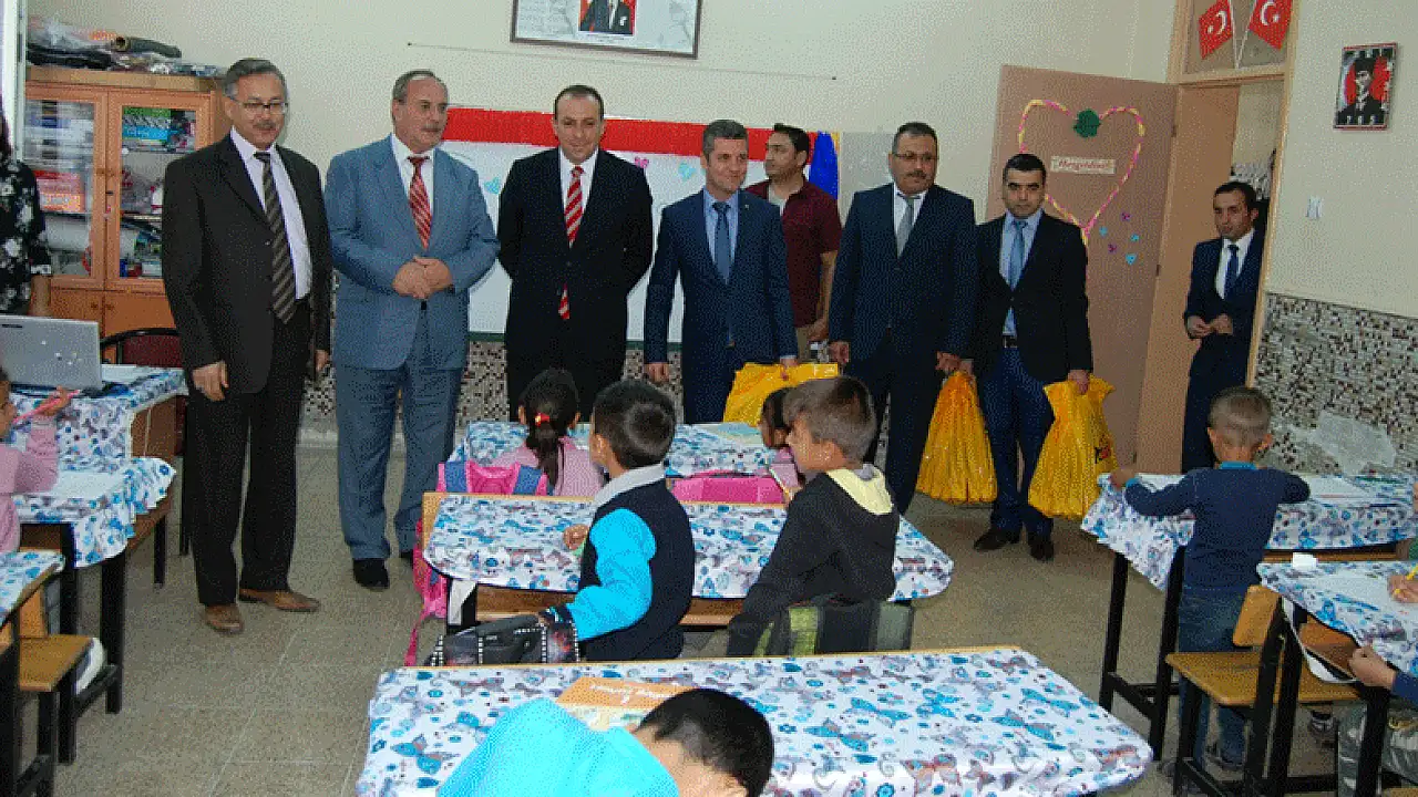 Karatay Kaymakamı Parlar ve PTT Başmüdür Yardımcısı Çalışkan, birinci sınıfların olduğu bir sınıfa girerek hediyeleri dağıttı.