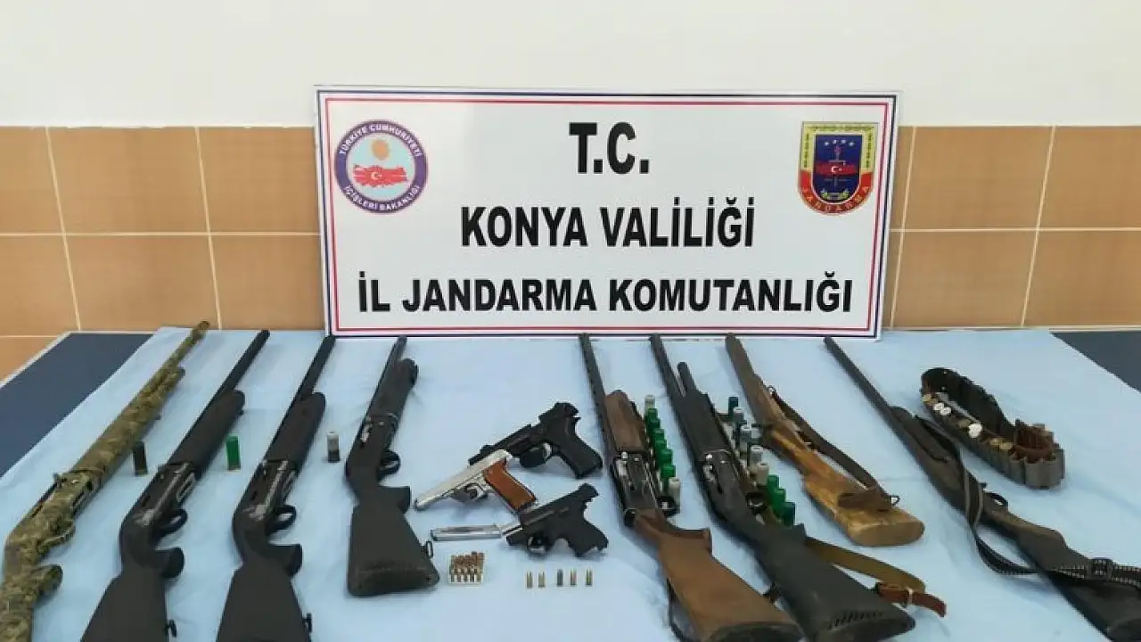 Konya İl Jandarma Komutanlığı ekiplerince Hüyük İlçesi İlmen Mahallesinde ruhsatsız av tüfeği ve tabanca satışı yaptığı bilgisi alınan M.Y., A.A., A.M.S. ve N.Y. isimli 4 şüpheli şahsın evinde arama yapıldı. Yapılan aramalarda, 8 ruhsatsız av tüfeği, 1'i kurusıkıdan bozma iki tabanca ve bir kurusıkı tabanca ele geçirildi. Ele geçen malzemeler muhafaza altına alınırken savcılık talimatıyla şüpheliler ifadelerinin alınması sonrası serbest bırakıldı.