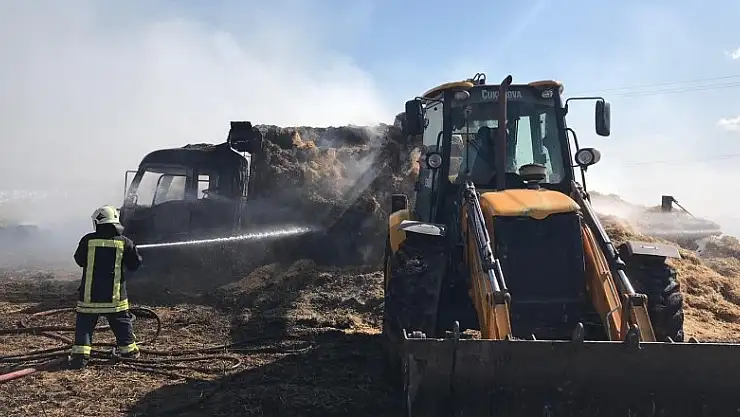 Konya'nın Yunak ilçesinde saman yüklü kamyon ve tarladaki saman balyaları alev alev yandı.