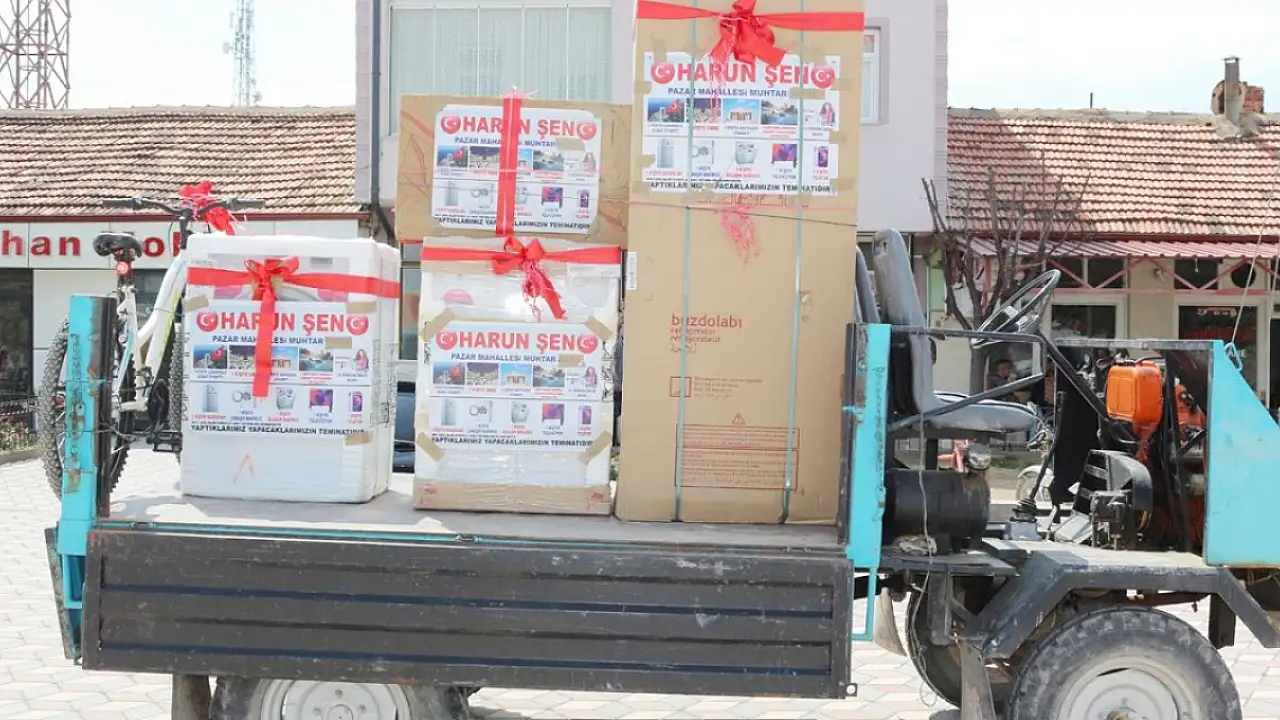 Konya'nın Tuzlukçu ilçesinde bir muhtar, seçmenlerine çeşitli hediyeler dağıttı.
