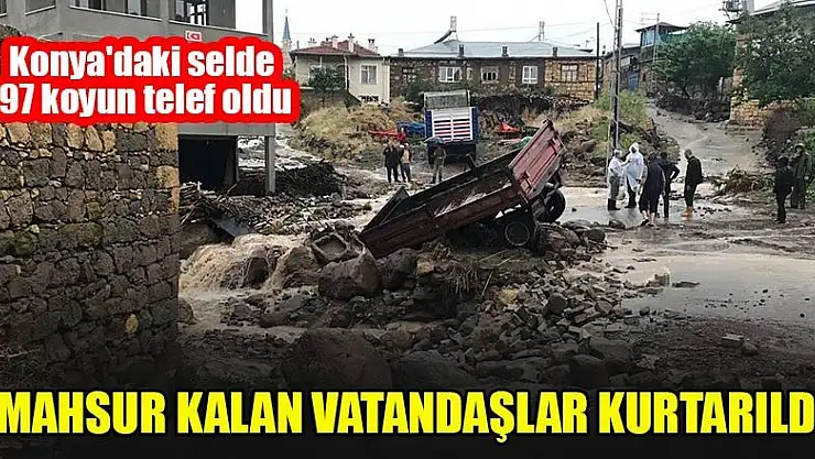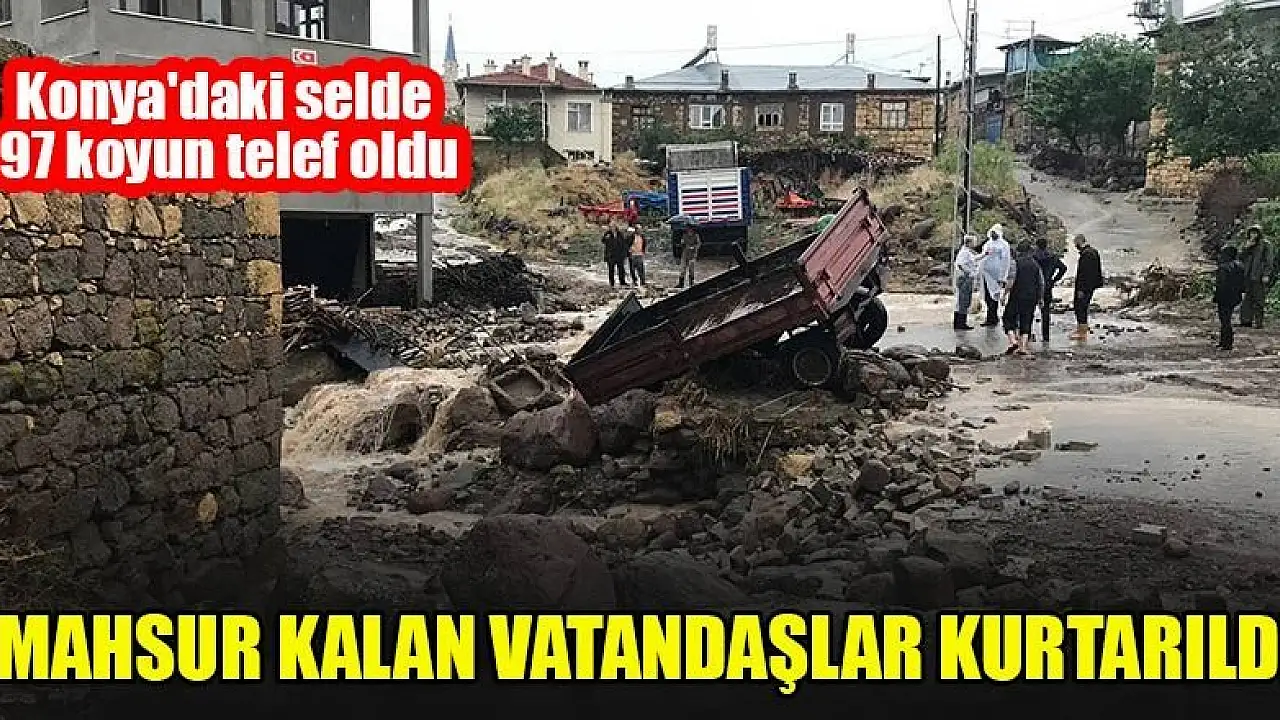 Konya'da sağanak yağmur sonrası meydana gelen selde mahsur kalan çoban ve iki engelli vatandaş kurtarılırken, yaklaşık 97 koyun telef oldu. Alt yapısında sel nedeniyle kayma olduğu belirlenen Çomaklar Mahallesi'nde hasar tespiti yapılacağı öğrenildi.