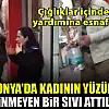 Kadının yardımına çevredekiler ve esnaf koştu. Sıvının ne olduğu ve atan kişinin kimliği henüz bilinmiyor.