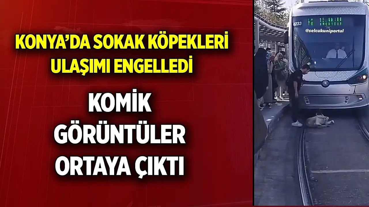 Konya'da Kampüs-Alaaddin Tepesi seferi yapan tramvay yoluna yatan iki köpek, ulaşımı engelledi. Üniversite öğrencileri köpekleri ikna etmeye çalışsa da başarılı olamadılar.
