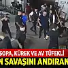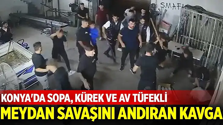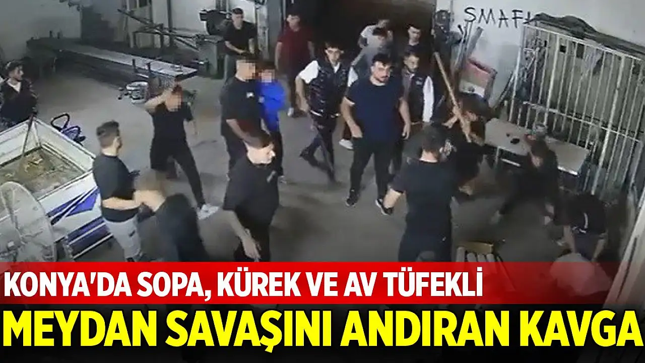 Konya'da bir iş yerine gelen çoğu çocuk yaştakilerden oluşan grubun, iş yeri sahibi iki kardeş ile sopa, kürek ve tüfekle meydan savaşını andıran kavga anı güvenlik kamerasına yansıdı.