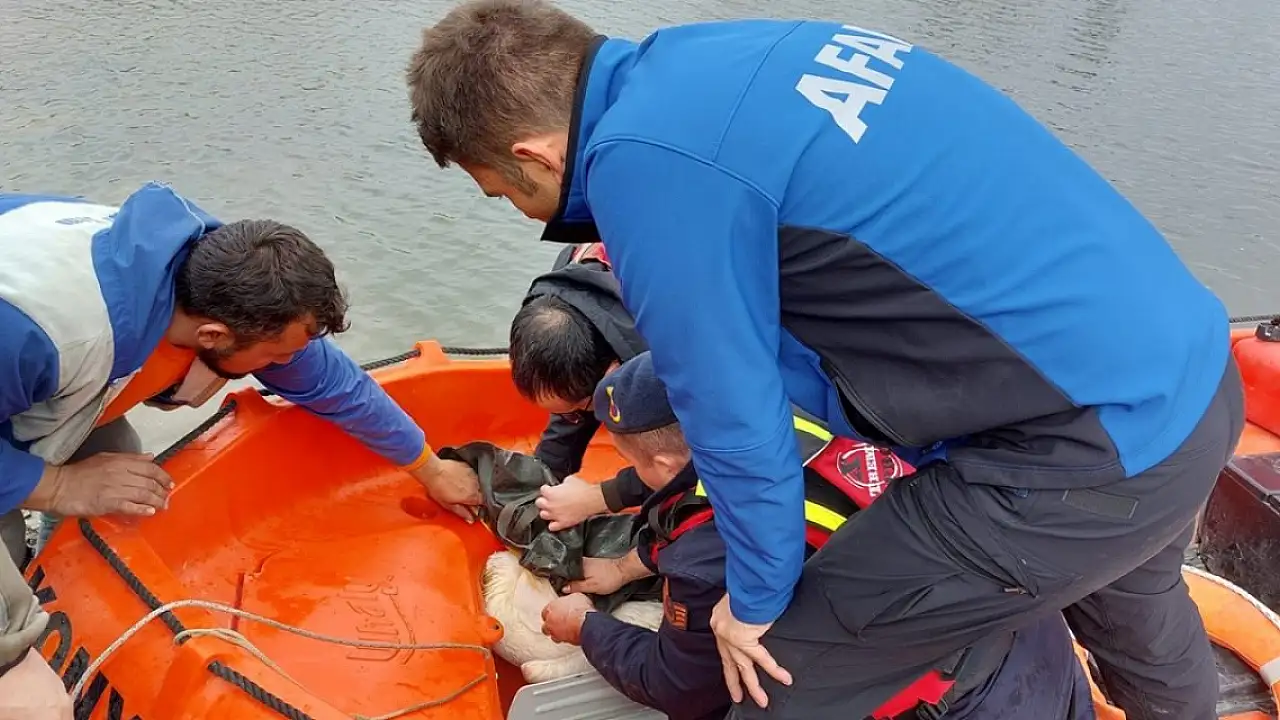 Kanatlarından yaralanarak suya düştüğü belirlenen pelikan, jandarma ve AFAD'ın su üstü arama ve kurtarma ekiplerince gölden alındı.