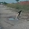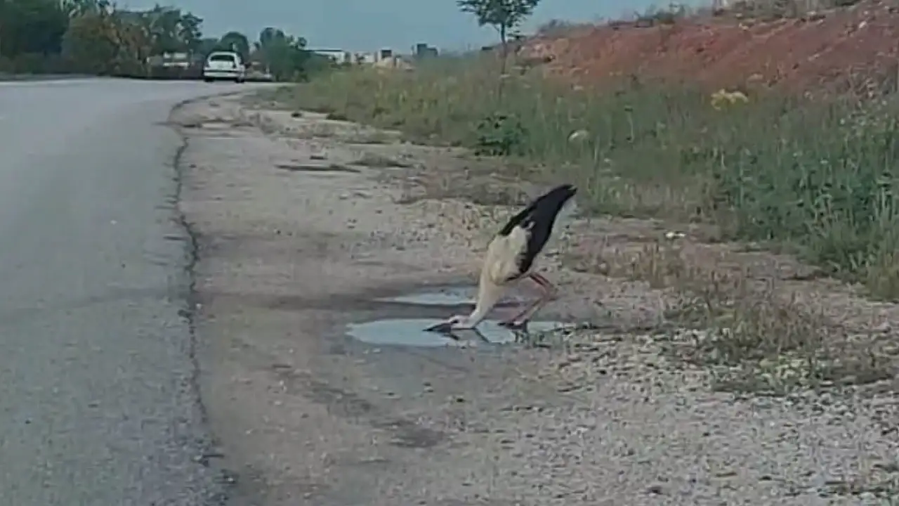Konya'nın merkez Selçuklu ilçesinde sürüsünden ayrı kalan bir leylek, yol kenarındaki su birikintisinden su içerken cep telefonuyla görüntülendi.