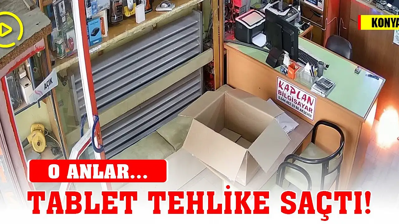 Konya'da teknik serviste tamir edilen tablet bir anda patlayarak alev topuna döndü. Patlama anı ve tamircinin paniklediği anlar iş yerinin güvenlik kamerasına anbean yansıdı.