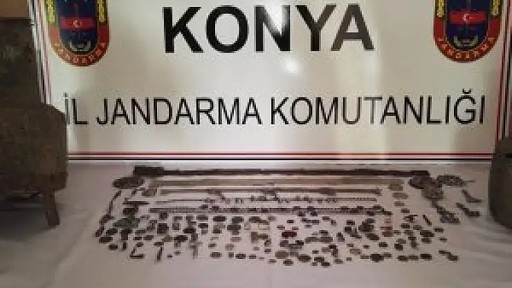 Konya'nın Güneysınır ilçesinde evde yapılan aramada 149 parça tarihi eser bulundu, ev sahibi gözaltına alındı.