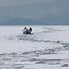 Konya'nın Beyşehir ilçesinde donan göldeki ağlarını almak için açılan balıkçı çift, batan tekneden buz kütlesi üzerine çıkarak kurtuldu.