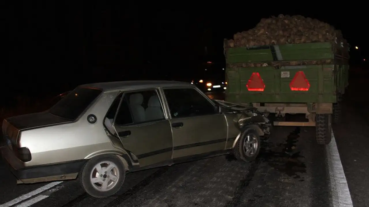 Alınan bilgiye göre, Mehmet Pırtık idaresindeki 42 B 9904 plakalı otomobil, Beyşehir-Seydişehir çevreyolunda bir petrol istasyonu yanında Ali Çay yönetimindeki 42 B 9603 plakalı şeker pancarı yüklü traktörün römorkuna arkadan çarptı.