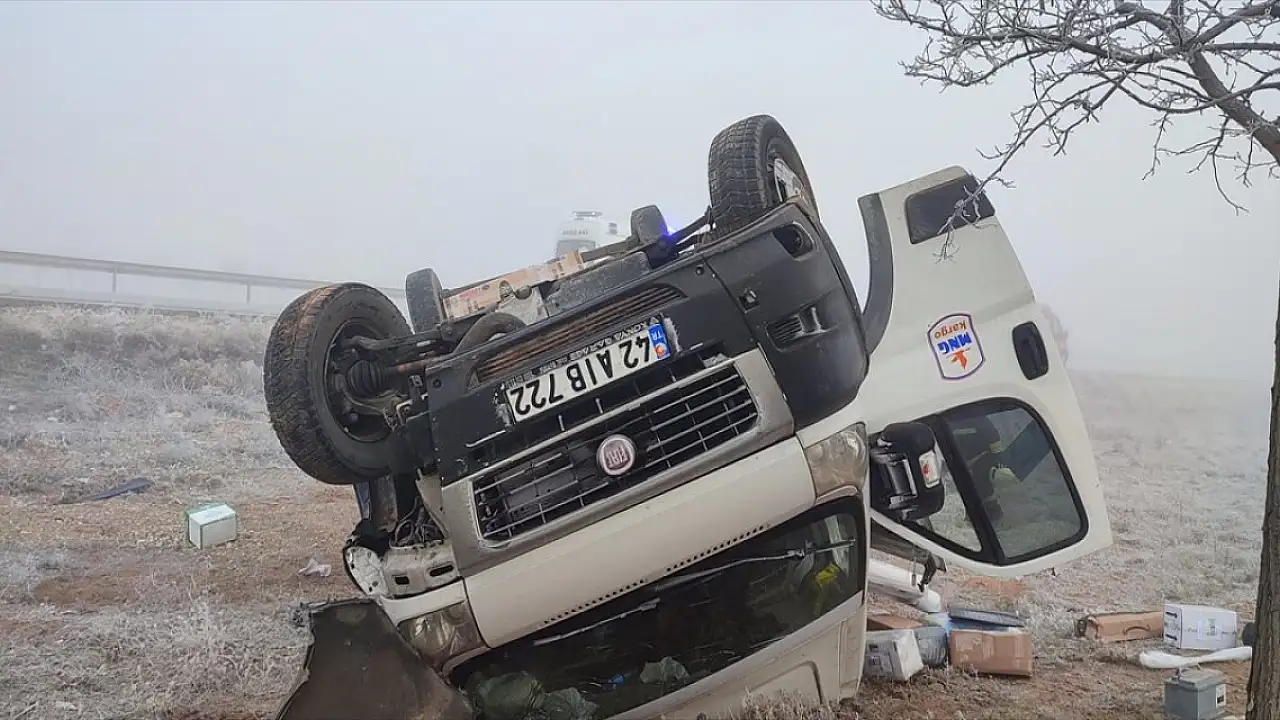 Ankara-Konya kara yolu Ağabeyli mevkisinde sürücüsünün kimliği belirlenemeyen 42 AIB 722 plakalı araç, yoğun sis nedeniyle şarampole devrildi.