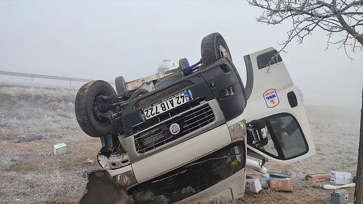 Konya'da trafik kazası! Kargo firmasına ait araç böyle devrildi
