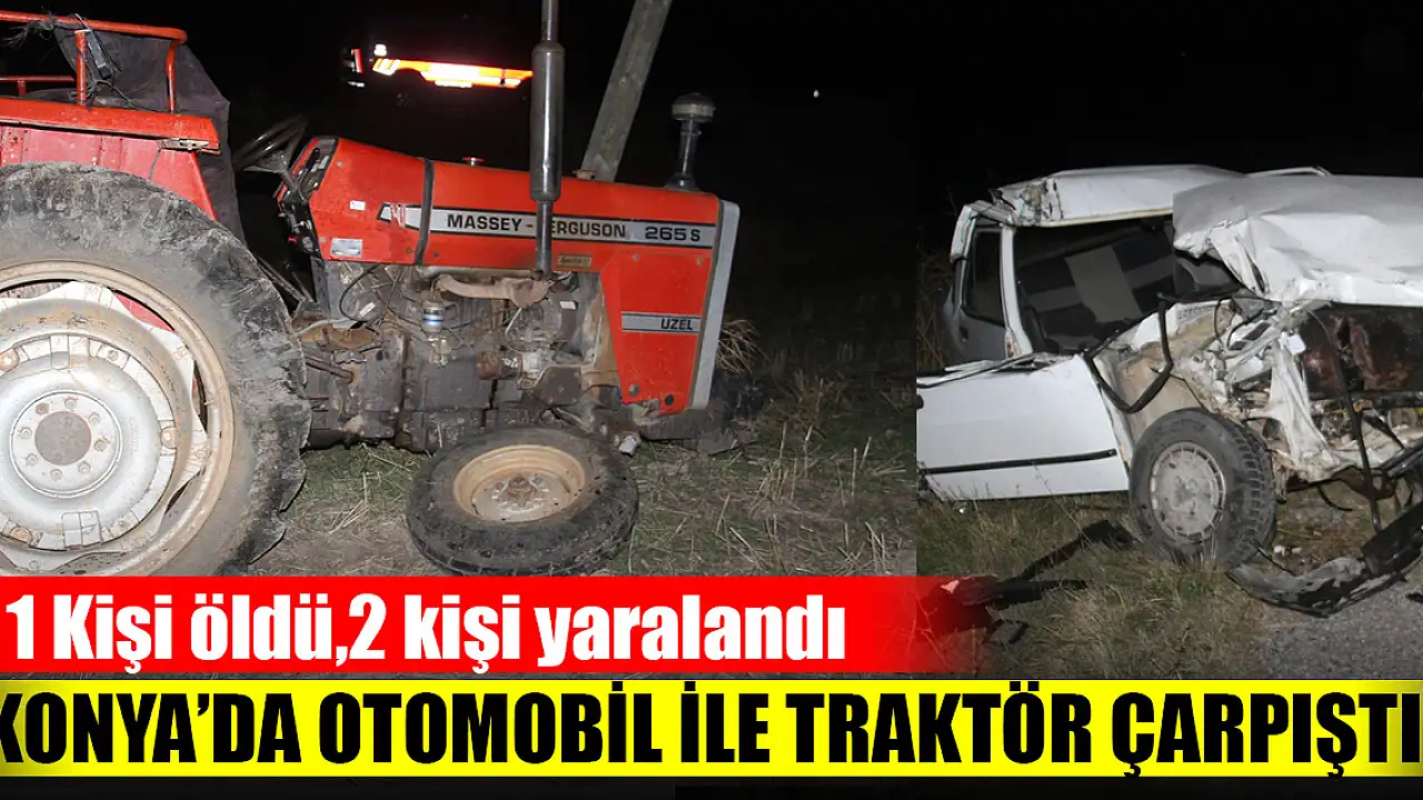 Konya'nın Hüyük ilçesinde traktörle otomobilin çarpışması sonucu meydana gelen kazada 1 kişi öldü, 2 kişi yaralandı.