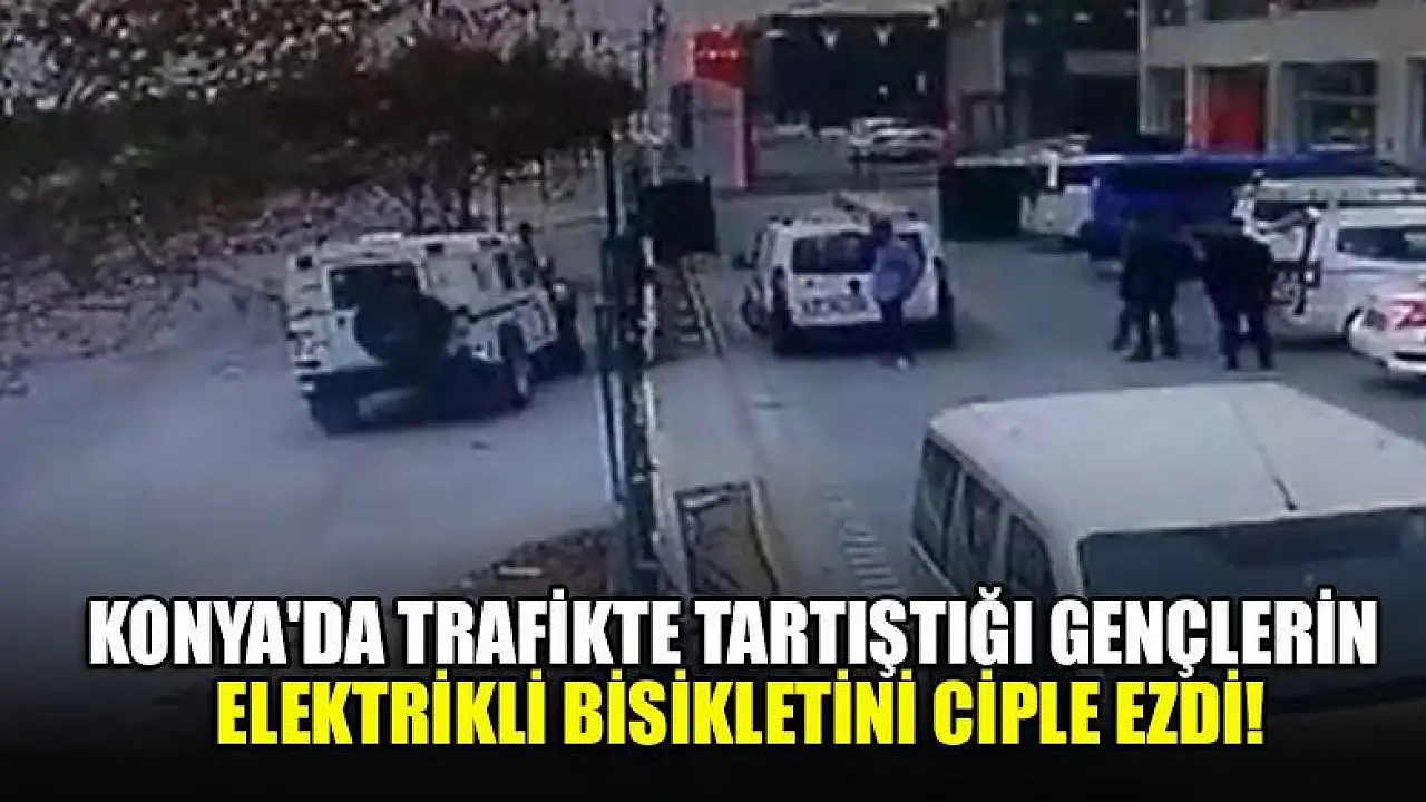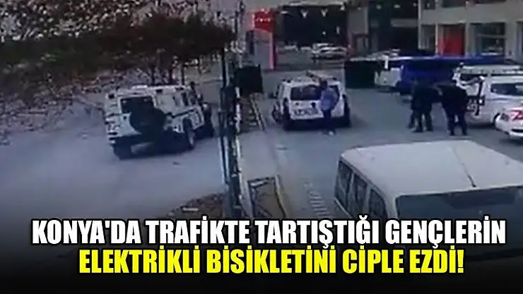 Konya'da trafikte yaşanan tartışma sonrası bir cip sürücüsü tartıştığı gençlerin elektrikli bisikletini ezdi. Olay anı ise güvenlik kamerasına saniye saniye yansıdı.