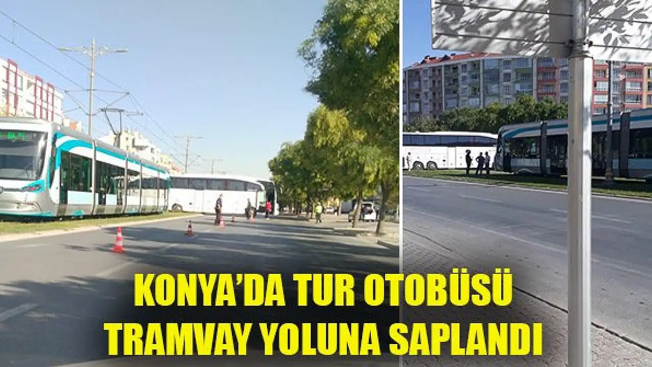 Konya'da tur otobüsü tramvay yoluna saplandı