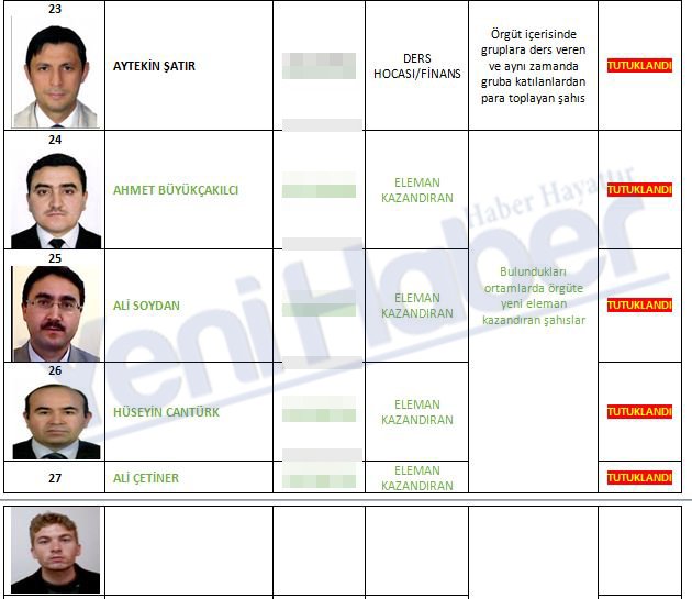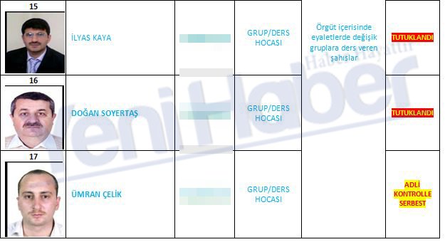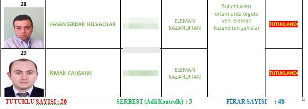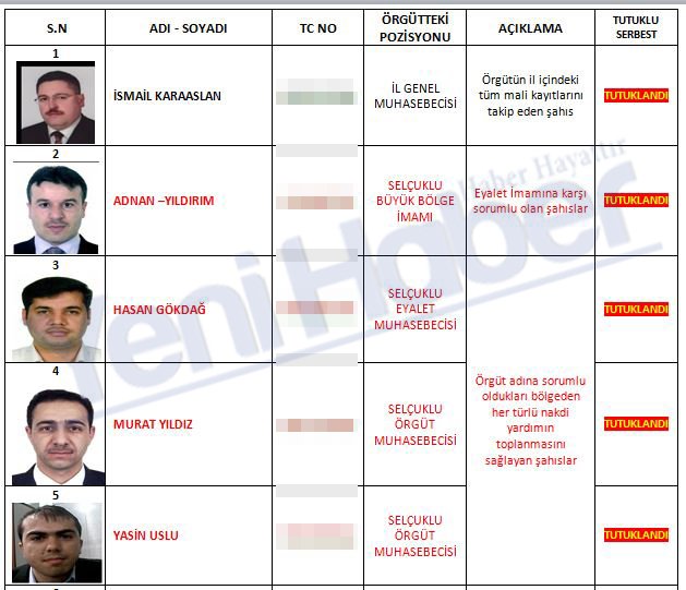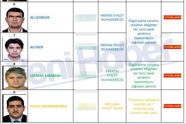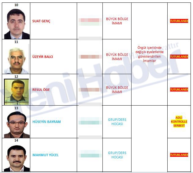 Gözaltı kararı verilenler arasında örgütün "İç Anadolu bölge imamı", "molla", "Konya il imamı", "eyalet imamlığı", "büyük bölge imamlığı", "il imamı sekreterliği", "il eğitim danışmanı", "eğitim kurumlarının genel müdürü", "mütevelli ve sohbet grupları hocası", "yapıya elaman kazandıran kişiler" ve "ders hocası finans grubu" gibi yapılanmalarda görev alan kişilerin de bulunduğu öğrenilmişti.Konya'da 26 FETÖ imamı tutuklandı