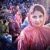 Yağmura rağmen alanı dolduran çocuklar, üzerlerindeki renkli yağmurlukla güzel görüntüler oluşturdu.