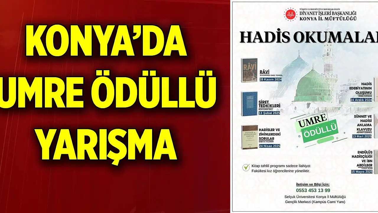Konya İl Müftülüğü organizasyonunda "Umre Ödüllü Hadis Okumaları" isimli yarışma gerçekleştirilecek. Kitap tahlili programı sadece İlahiyat Fakültesi kız öğrencilerine yönelik olacak. 6 adet hadis kitabının içindeki hadislerden yapılacak yarışma Kazım ayında başlayacak son kitabın yarışması ise mayıs ayında yapılacak. Selçuk Üniversitesi Konya İl Müftülüğü Gençlik Merkezi (Kampüs Camii Yanı) olacak yarışma için İletişim ve Bilgi İçin 0553 453 13 99 numaralı hattan gerekli bilgiler alınacak.