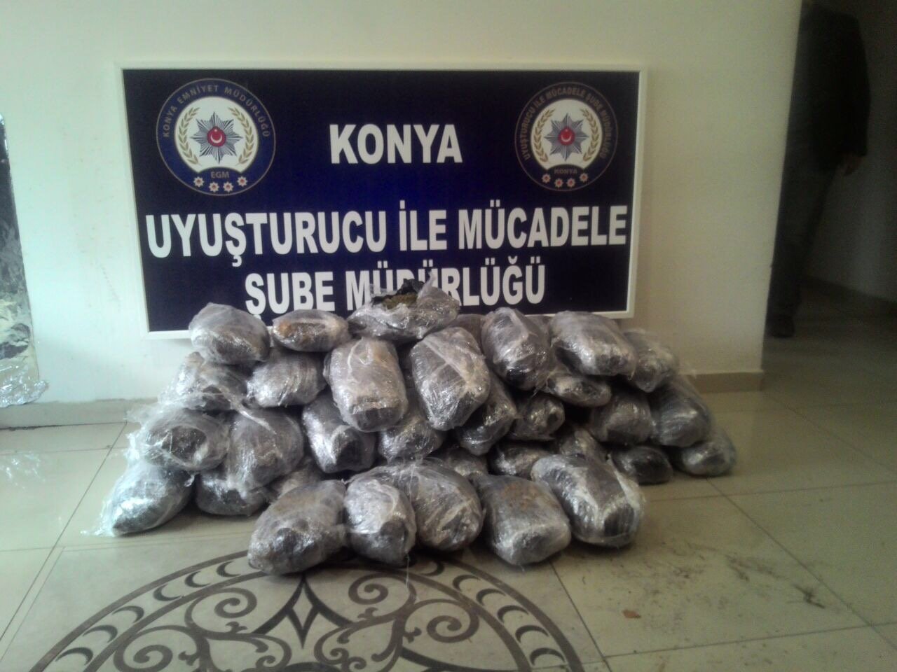 Konya-Karaman karayolu kent girişinde durdurulan soğan yüklü kamyonda 60 kilogram esrar ele geçirildi, sürücü Kemal A. gözaltına alındı.