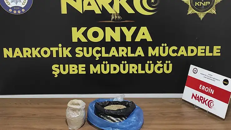 Konya İl Emniyet Müdürlüğü Narkotik Suçlarla Mücadele Şube Müdürlüğünce yapılan sokak satıcılarına yönelik detaylı çalışmalar neticesinde, iki şahsın uyuşturucu sevkiyatı yapacağı bilgisine ulaşıldı. Narkotik ekiplerince takibe alınan şahıslara yönelik yapılan operasyonda şahısların üzerinde ve eşyalarında yapılan aramada 1 kilo 750 gram Eroin maddesi ele geçirildi.