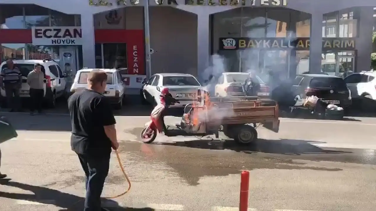 Edinilen bilgiye göre, M.K. idaresindeki üç tekerlekli motosiklet, çarşı merkezinde seyir halindeyken Hüyük Belediyesi hizmet binası önüne geldiğinde henüz bilinmeyen bir sebeple ön kısmından alevler yükseldi.