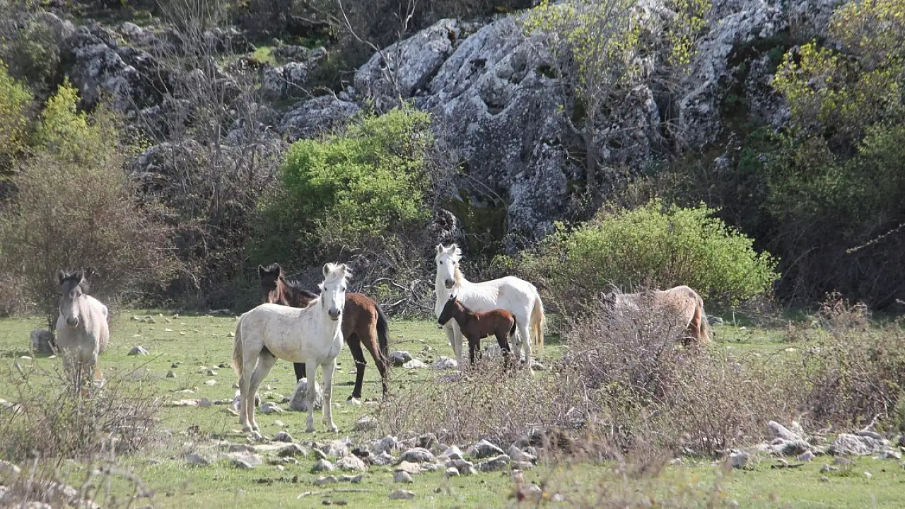 Konya'nın Beyşehir ilçesinde doğa yürüyüşü yapan grup meşhur yılkı atları ve taylarına denk geldi.